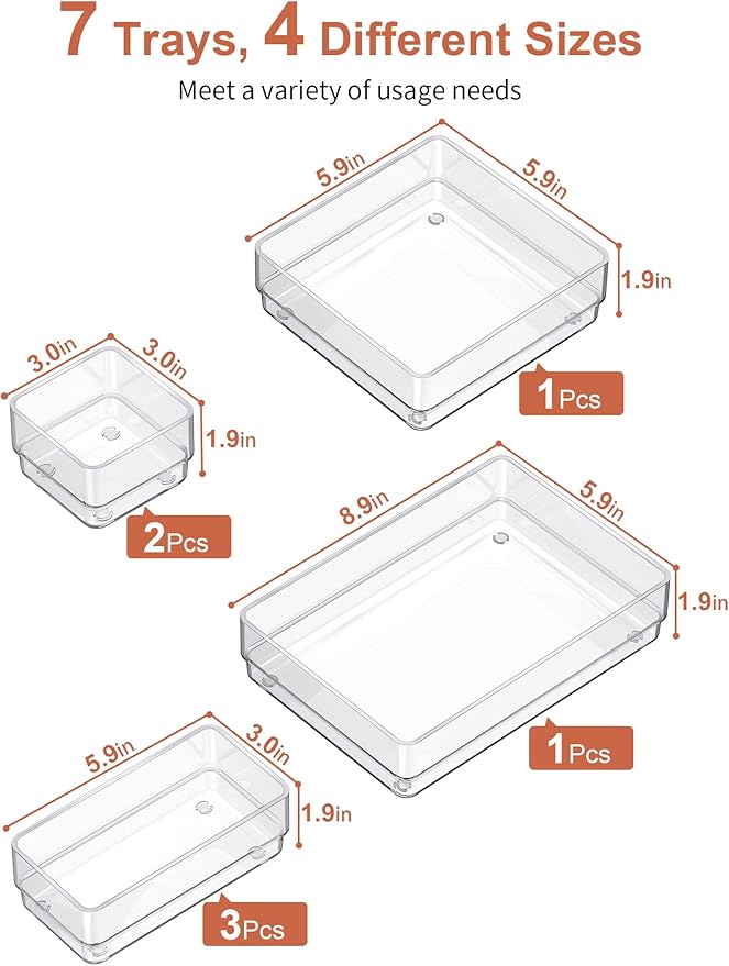 - 4 Sizes to Fit All Your Needs- This drawer organizer set includes 7 trays in 4 functional sizes, allowing you to sort everything from office supplies to makeup tools without wasting drawer space. Whether you're organizing stationery, long utensils, or cosmetics, each tray fits snugly to avoid clutter or shifting. Sizes include: 8.9 x 5.9 x 1.9 in (1), 5.9 x 5.9 x 1.9 in (1), 5.9 x 3.0 x 1.9 in (3), 3.0 x 3.0 x 1.9 in (2).