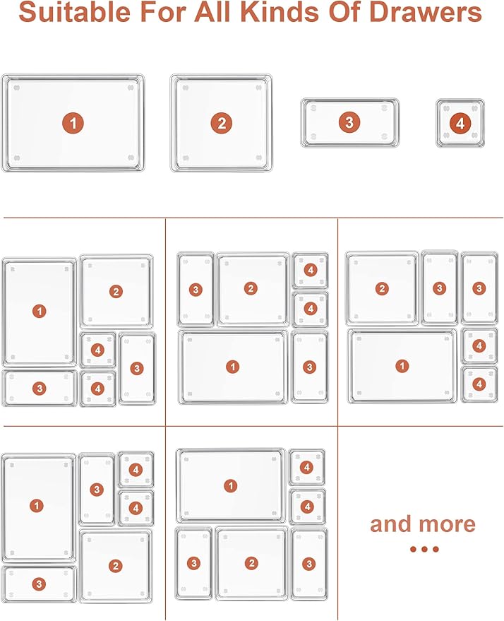 - Clear & Durable at a Glance- Made of sturdy PS plastic, each makeup drawer organizer is resistant to cracking or warping. The transparent design lets you quickly identify contents at a glance—ideal for busy mornings or work routines.