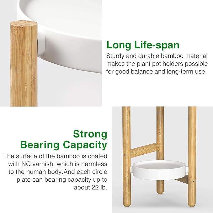 - 【Material】Sturdy and durable bamboo make the plant pot holders possible for good balance and long-term use. The round plate anti-rust pot saucers are easy to clean and wearable carbon steel material for better bearing capacity.