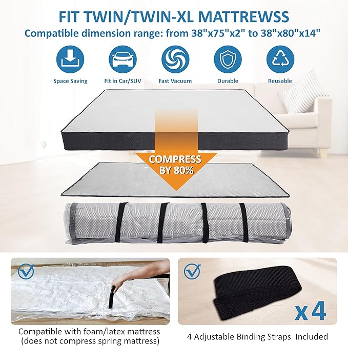 Twin/Twin XL Foam Mattress Vacuum Bag for Moving, Mattress Vacuum Seal Storage Bag with Straps