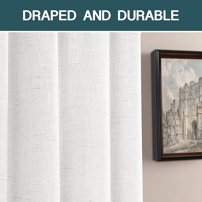 - PREMIUM NATURAL LINEN: These soft linen rod pocket curtains are crafted from open weave linen blended fabric, durable, primitive and natural effect make the panels more draped and aesthetic. Timeless classic linen combined with the rich warm look will transfer the room decor. Note: the color is more beige instead of pure white color
