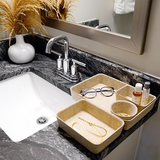 - 【Sustainable material】: recycled felt with comfortable touch feeling,, no noisy like plastic , keeps stuff from flying around in the drawer. soft to prevent scratching, flexible for space saved up on desk, kitchen,bathroom or anywhere you desire with these stylish storage and organizer bins.