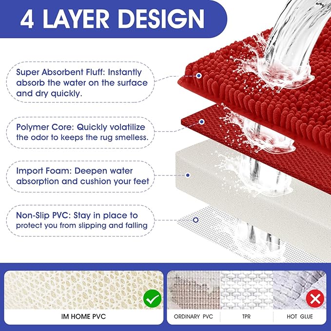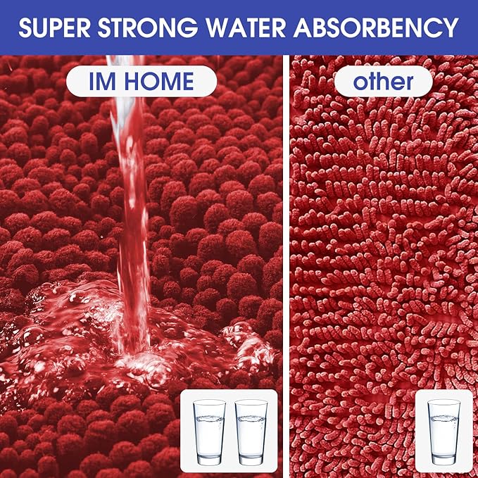 - SUPERIOR ABSORBENCY: The bold pile chenille on the top surface of the luxurious toilet mat soak up a lot of water and keep your floor dry when you're stepping out of the bath, Bathtub, shower, or getting ready by the sink, moisture is trapped in the bathroom rug’s deep pile, to avoid the dripping water disturbing your bathroom's serenity and tidy.