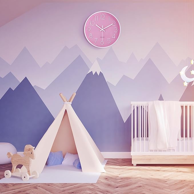 Lafocuse 12 Inch Pink Wall Clock Battery Operated for Kitchen Living Room, Silent Kids Analog Clock for Girls Bedroom, Pink Home Décor