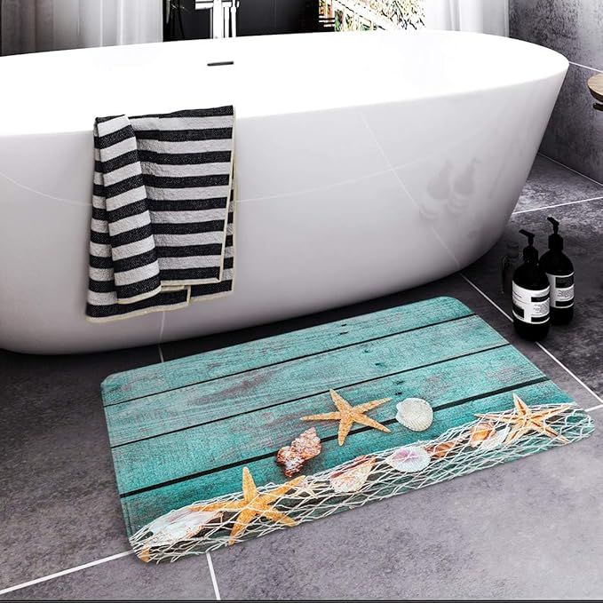 Britimes Bath Mat for Bathroom, Beach Seashells Starfish Sand Washable Cover Floor Rug Carpets Floor Mat Bathroom Decorations 18x30 Inches for Kitchen Bedroom Indoor