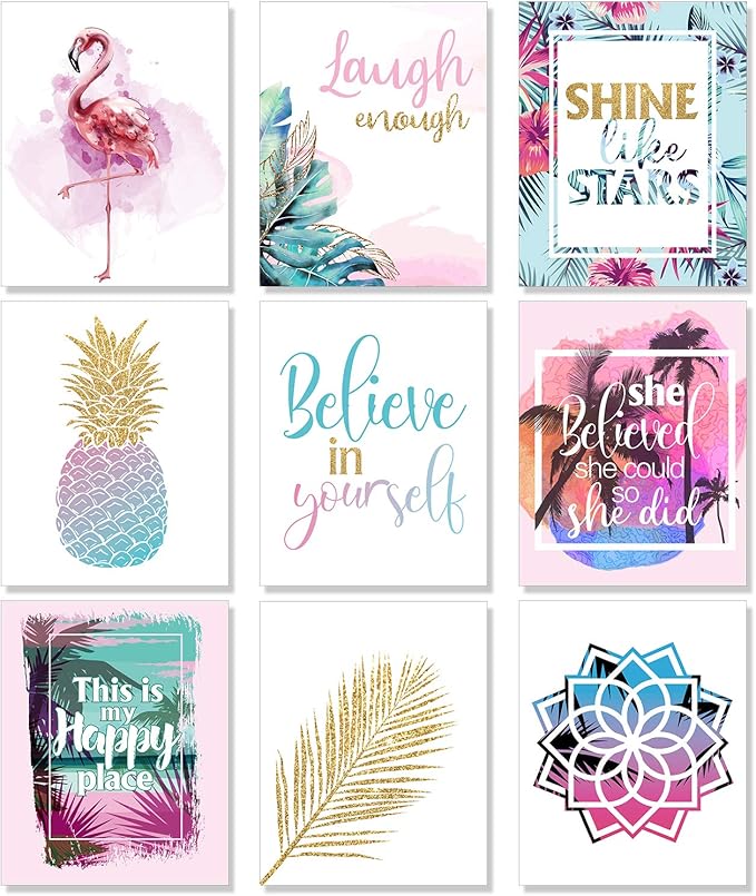 Outus Set of 9 Inspirational Prints Teen Girl Room Wall Art Flamingo Pineapple Leaf Motivational Phrases Posters Girls Bedroom Home Decorations Unframed