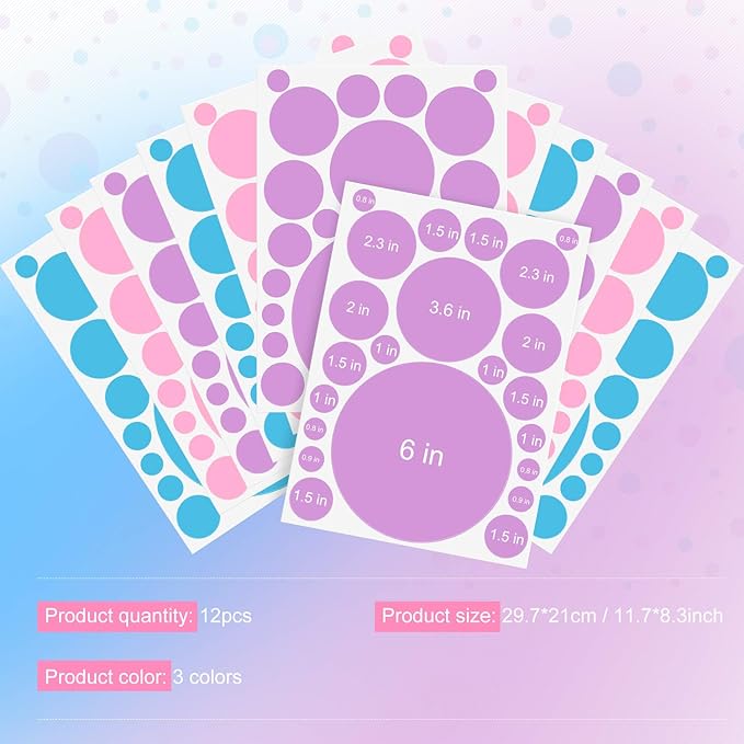 - What you'll get: package includes 12 sheets in 264 pieces polka dots wall stickers with bright color, each sheet has 22 pieces in 8 different size, enough quantity to decorate, creating a lovely room, beautiful backdrops for photo shooting