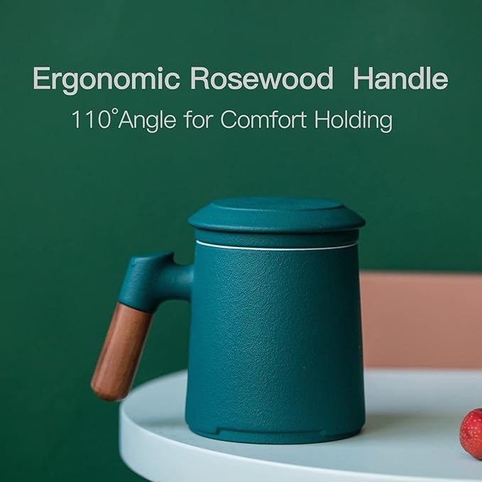 ZENS Tea Cup With Infuser and Lid, 12oz Green Mug for Loose Leaf Steeper, Wood Handle With Fine Strainers Hot Diffusers, Ceramic Mugs Accessories for Lovers Gifts
