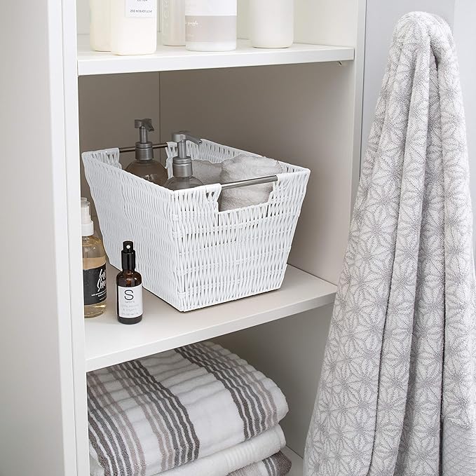 Simplify 12"x10"x8" Medium Woven Basket for Storage with Handles, Nursery, Playroom, Toys, Bedroom, Closet, Clothes, Office, Decorative Organizer Rattan Totes, White