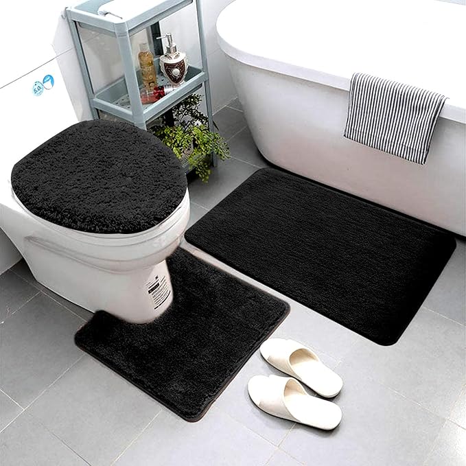 Smart Linen 3 Piece Bathroom Rug Set Includes Bath Rug, Contour Mat and Toilet Lid Cover, Machine Washable, Super Soft Microfiber & Non Slip Bath Rugs with Rubber Backing Solid (Black)