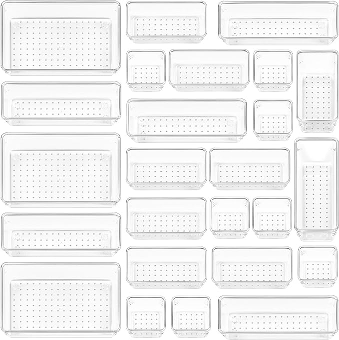 Vtopmart 25 PCS Clear Plastic Drawer Organizers Set, 4-Size Versatile Bathroom and Vanity Drawer Organizer Trays, Storage Bins for Makeup, Bedroom, Kitchen Gadgets Utensils and Office
