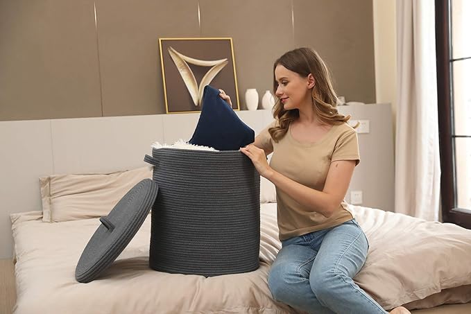 16" x 16" x 18" Extra Large Storage Basket with Lid, Cotton Rope Storage Baskets, Laundry Hamper, Cloth Bin, for Clothes Towels Blankets Pillows Storage in Living Room, All Dark Grey