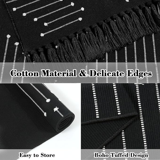 LIVEBOX Boho Black Bathroom Rug 2 x 3 Washable Throw Rugs, Small Cotton Woven Bath Mat, Moroccan Area Carpet with Tassel for Entryway Kitchen Sink Front Door