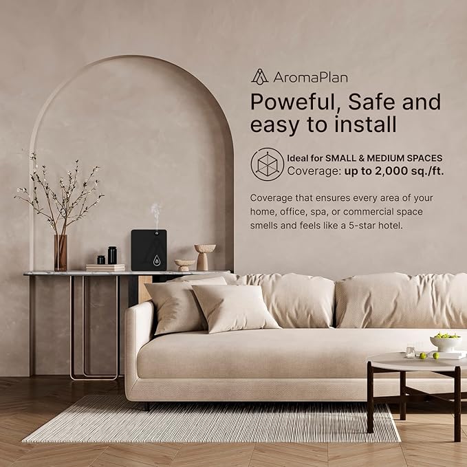 - AMAZING FRAGRANCE IN EVERY CORNER: The AromaPlan nebulizer has an incredible 1,500 Sq Ft coverage so that every area of your home, office, spa or commercial space will smell and feel like a 5-star hotel. The AromaPlan diffuser system is very user-friendly, with automatic and App control that you can schedule according to your daily needs and never waste your favorite scent again!