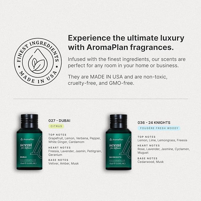 - ULTIMATE AROMA EXPERIENCE includes the AromaPlan scent home machine, designed to efficiently cover an area of 1,500 to 2,000 Sq Ft, ensuring your space is filled with aroma in minutes. Paired with the AromaPlan's Top Picks Fragrance Kit, this set features two meticulously crafted scents: Dubai, and 24 Knights in 1.5 fl.oz (45 ml) bottles. Perfect for choosing your favorite aroma and transforming any large space into a fragrant haven instantly.