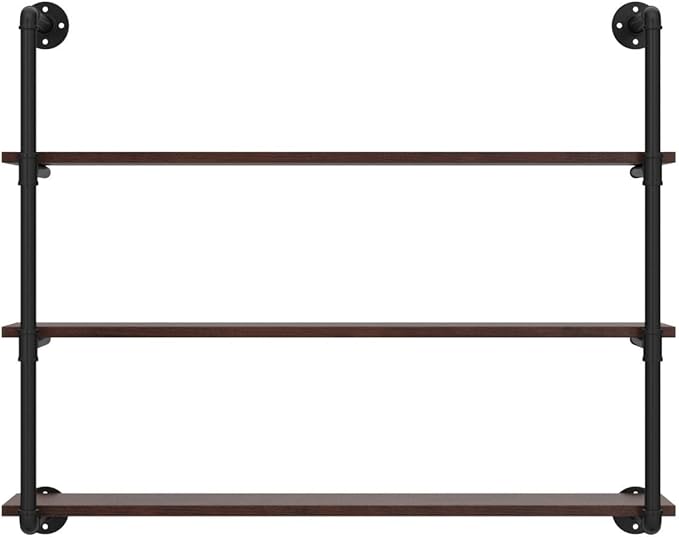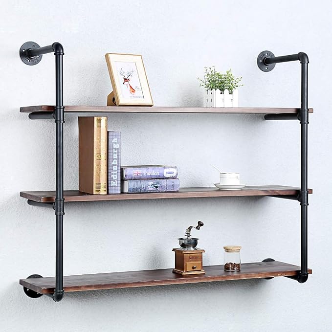 Industrial Pipe Shelving Wall Mounted,42in Rustic Metal Floating Shelves,Steampunk Real Wood Book Shelves,Wall Shelf Unit Bookshelf Hanging Wall Shelves,Farmhouse Kitchen Bar Shelving(3 Tier)