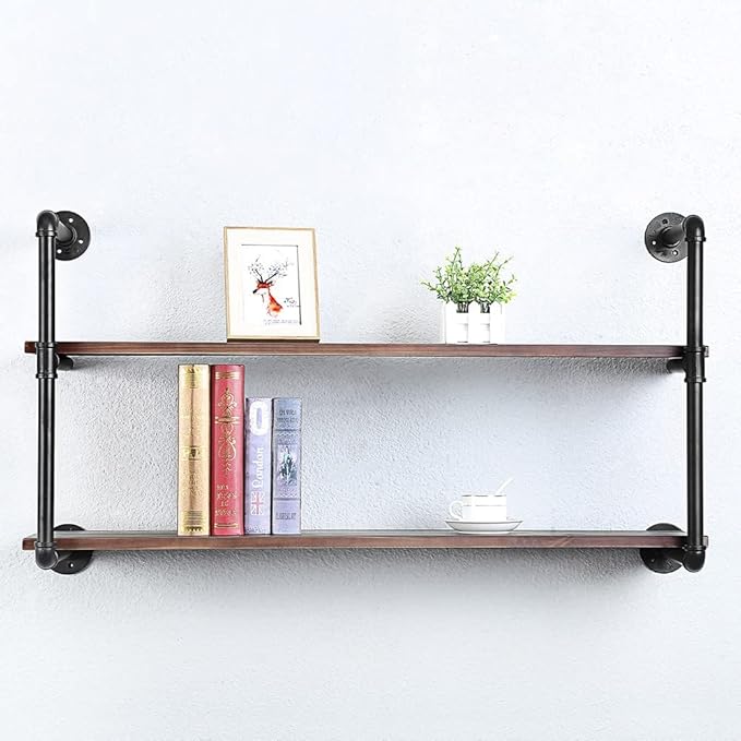 Industrial Pipe Shelving Wall Mounted,42in Rustic Metal Floating Shelves,Steampunk Real Wood Book Shelves,Wall Shelf Unit Bookshelf Hanging Wall Shelves,Farmhouse Kitchen Bar Shelving(2 Tier)