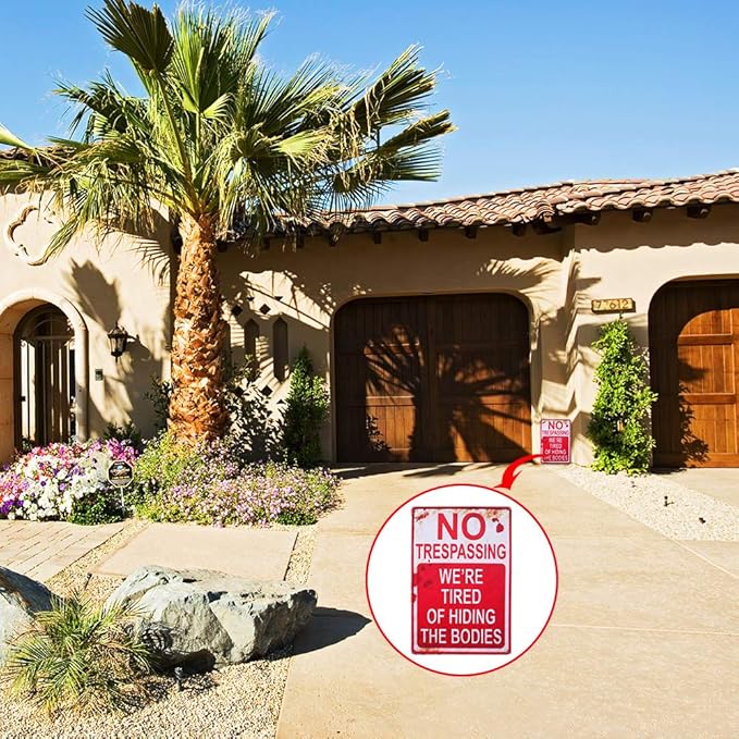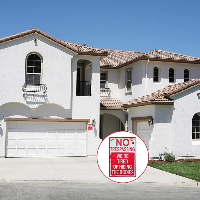 - Halloween Props:This No Trespassing Novelty Sign is perfect for any home or other institution in the United States.This is the best choice for"halloween signs" "No Trespassing We're Tired of Hiding The Bodies signs" "Beware of Well Just Beware sign" "halloween signs decor"“No Trespassing”.