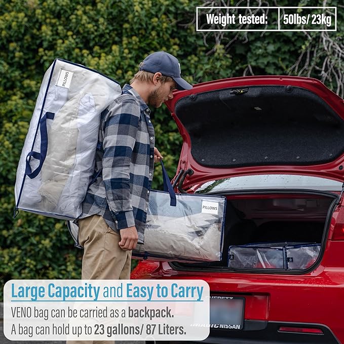 - Dual Carrying Options w/ Backpack Straps & Handles - Carry heavy loads effortlessly with VENO's versatile storage & moving bags. Designed with robust poly webbing straps, our packing bags can be worn like a backpack or carried using the strong handles. Capable of holding up to 50 pounds and offering 23 gallons of space, VENO bags ensure durability and water-resistance with PP-woven material.VENO bags are sustainable and reusable, designed for convenience and durability. 29.1"L x 14.2"W x 13"H.
