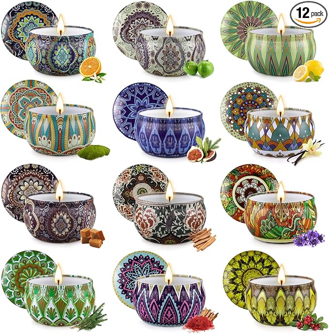 - Scented Candles Gift Set - Contains 12 Scents: Bergamot, Campfire Marshmallow, Apple Cinnamon, Juniper and Lavender, Orange Ginger, Mango Almond, Jasmine,ocean, Mahogany Teak, Sage, Lavender, Sandalwood
