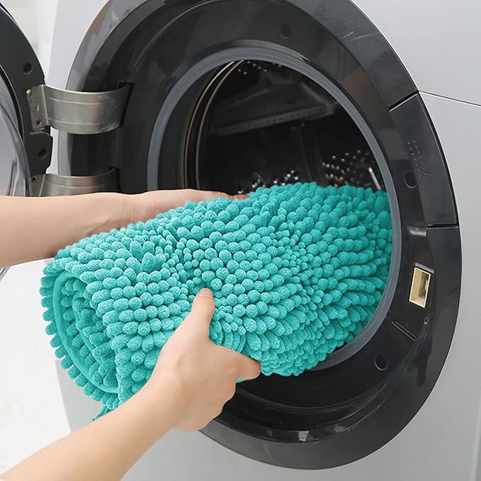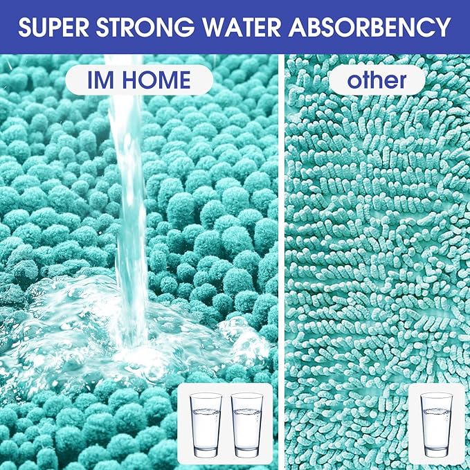 - SUPERIOR ABSORBENCY: The bold pile chenille on the top surface of the luxurious toilet mat soak up a lot of water and keep your floor dry when you're stepping out of the bath, Bathtub, shower, or getting ready by the sink, moisture is trapped in the bathroom rug’s deep pile, to avoid the dripping water disturbing your bathroom's serenity and tidy.