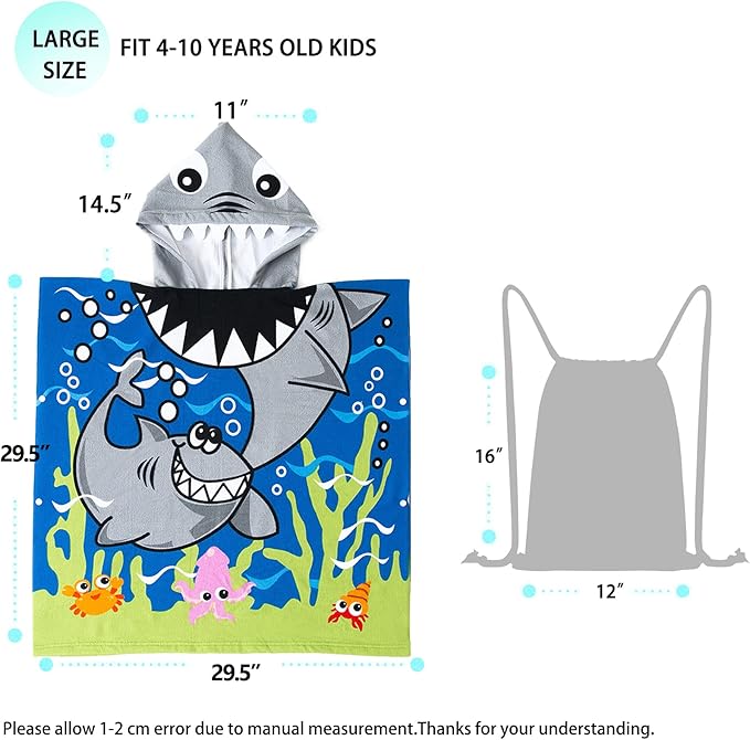 - SIZE: The kids hooded beach pool towel poncho measures 29.5"x29.5" in length with a 13.7x13.7" hood. This baby beach bath towels with hood is large enough for growing toddlers and kids(6-12 years old) or anyone under 60 inch girls boys.