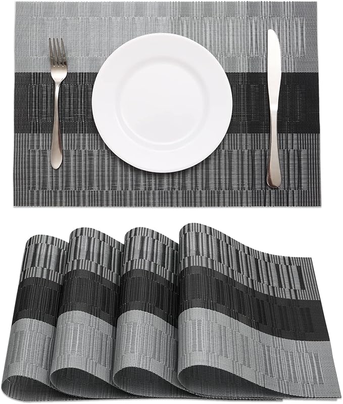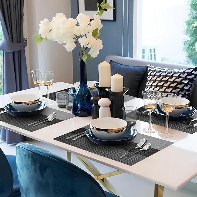 HeloHo Black Placemats Set of 4 Heat-Resistant Washable Place Mats Non-Slip Vinyl Woven Table Mats Wipeable Placemat for Kitchen Dining Table Decoration Indoor Outdoor