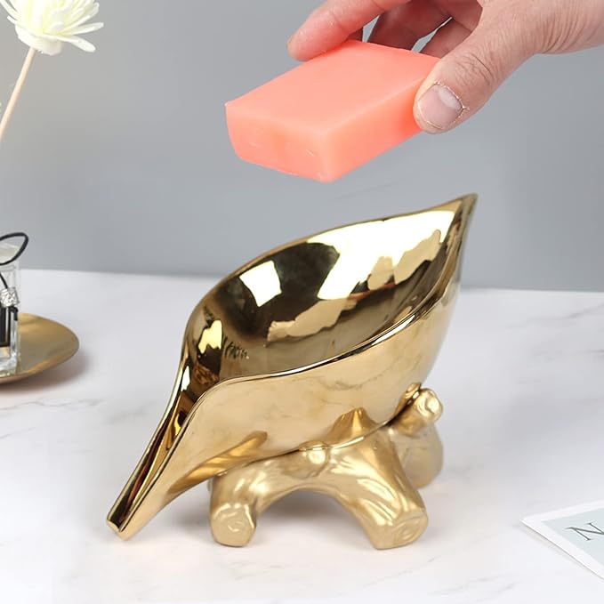 Leaf Soap Dish for Shower,Ceramic Soap Holder with Stump Bathroom Ring Dish Holder for Jewelry Engagament Wedding Birthday Gifts Gold