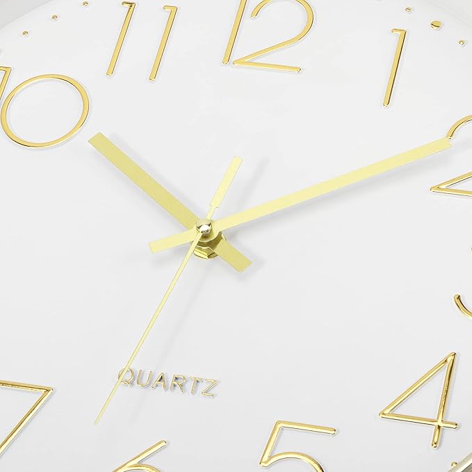 - Luxury Design: Stylish designed white dial with large gold numbers and high-quality sturdy gold frame. This functional wall art is beautiful and practical. Gold color frame makes it a perfect decorative clock for office, living room, kitchen, hallway...
