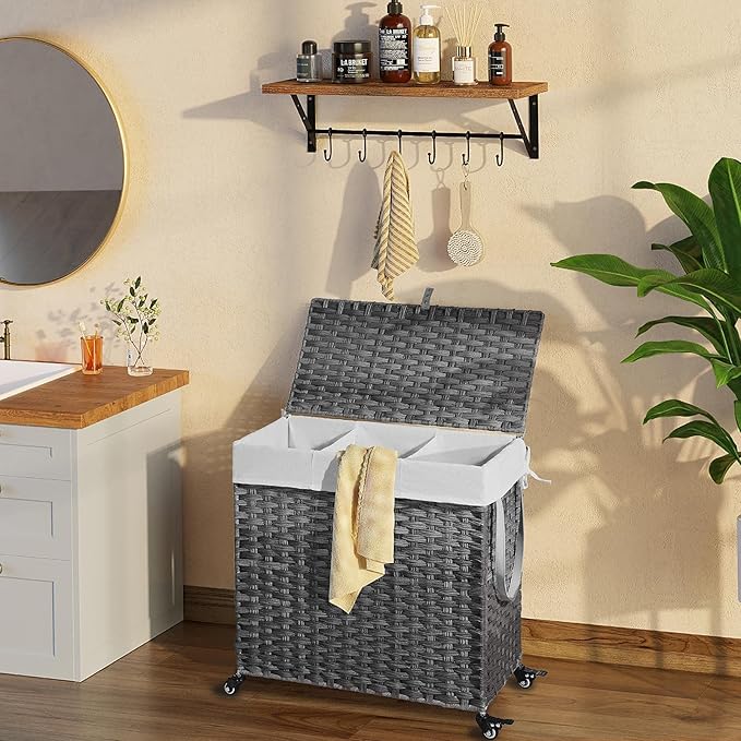 - Wide Inner Space - 2 types of liner bag of different specifications - 2-section liner bag can hold larger pieces and more clothes in each grid, 3-section liner bag can easily sort clothes of different colors. The thickened wire frame on the laundry basket improves load bearing capacity and leaves more space inside. Added PU decorative handles, make it easy to open the hamper lid to put the dirty clothes into the basket, keeping your room tidy and clean