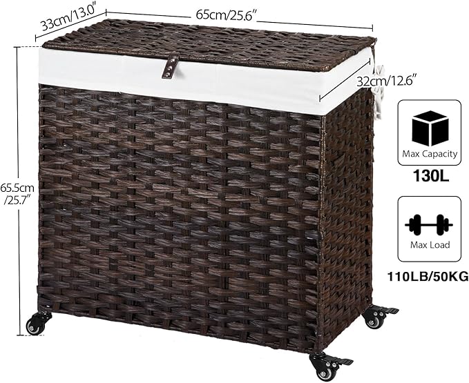 - Easy to assemble, large capacity - Convenient tools are equipped for easy installation. Large capacity 130L size: 25.6 (L) x 13.0 (W) x 25.7 (H) in. The laundry basket with double-sided Inscribed handle can easily move blankets, towels or daily clothes among different rooms. The maximum load capacity is 110LB