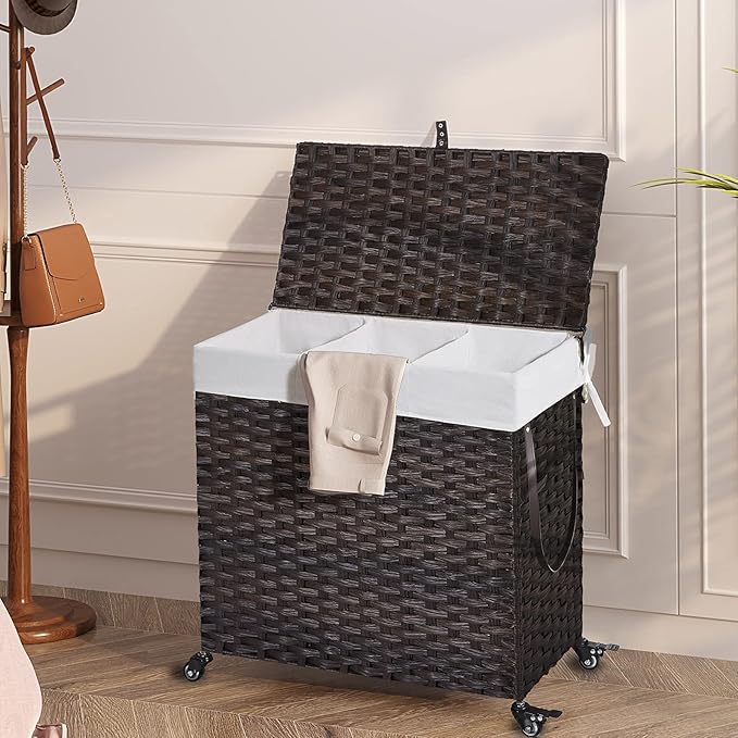 - Wide Inner Space - 2 types of liner bag of different specifications - 2-section liner bag can hold larger pieces and more clothes in each grid, 3-section liner bag can easily sort clothes of different colors. The thickened wire frame on the laundry basket improves load bearing capacity and leaves more space inside. Added PU decorative handles, make it easy to open the hamper lid to put the dirty clothes into the basket, keeping your room tidy and clean