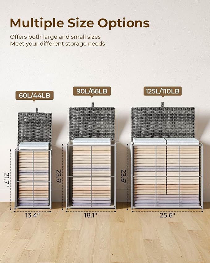 - Easy to assemble, multi-purpose capacity: Convenient tools are equipped for easy installation. There are 3 sizes: 60L size: 13.4 (L) * 13.4 (W) * 21.7 (H) inches, 90L size: 18.1 (L) * 13 (W) * 23.6 (H) inches, 125L sizes: 25.6 (L) * 13 (W) * 23.6 (H) inches. The laundry basket with double-sided Inscribed handle can easily move blankets, towels or daily clothes among different rooms