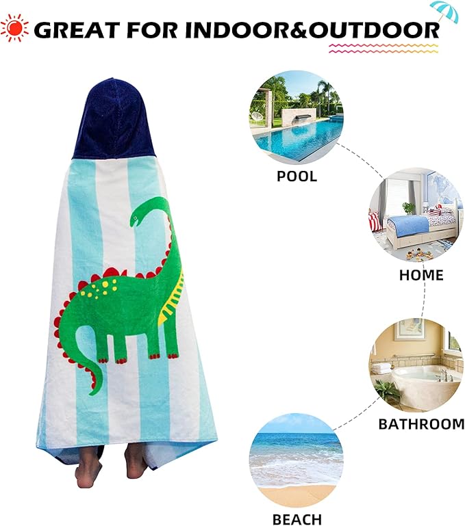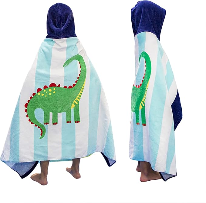 - Fun Cartoon Design: The colorful cartoon elements of the kids' bath towel, such as Dolphin, Dinosaur, Ocean Fish and Ship, Cool Fire Fighting, all are so cute! And with the hood, Warm or Sun-Protection. Snaps design makes the kids cotton bath towel not easy to drop and prevent children from catching a cold