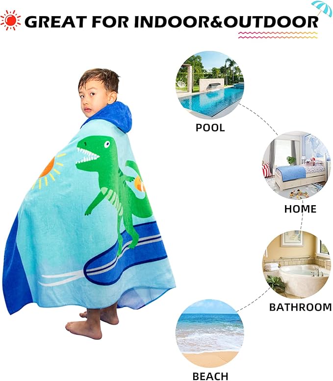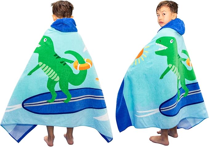 - Fun Cartoon Design: The colorful cartoon elements of the kids' bath towel, such as Dolphin, Dinosaur, Ocean Fish and Ship, Cool Fire Fighting, all are so cute! And with the hood, Warm or Sun-Protectionan. Snaps design makes the kids cotton bath towel not easy to drop and prevent children from catching a cold