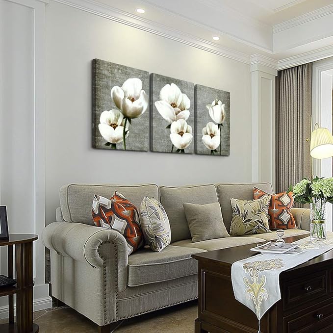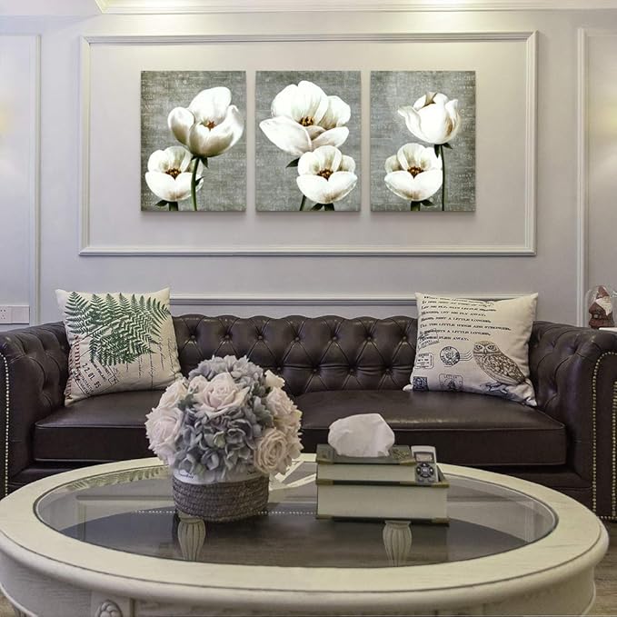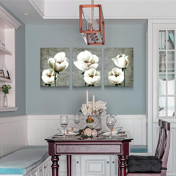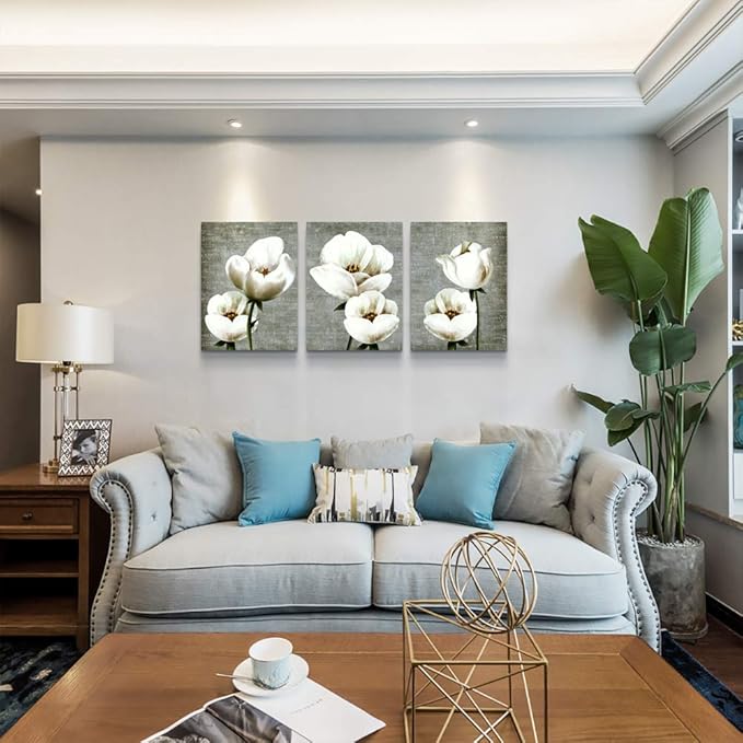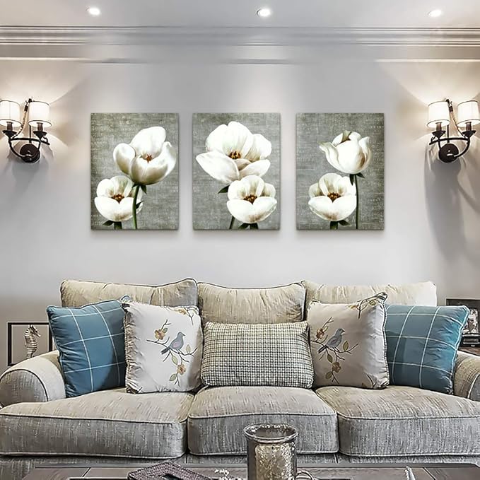 Large Wall Decor Living Room Canvas Wall Art For Bedroom Gray Green Vintage Style White Flowers Wall Painting Abstract Pictures Artwork Wall Decorations For Kitchen Modern Room Home Decor 3 Piece