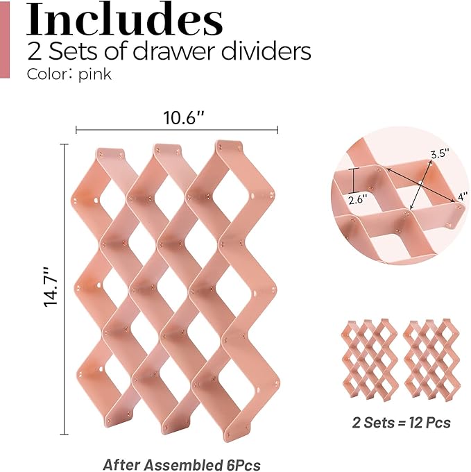 ROUFA Sock Drawer Organizer for Dresser, Honeycomb Underwear Dividers for Women, Panty Separator for Bras, Socks, Belt and Leggings (12pcs.Pink)
