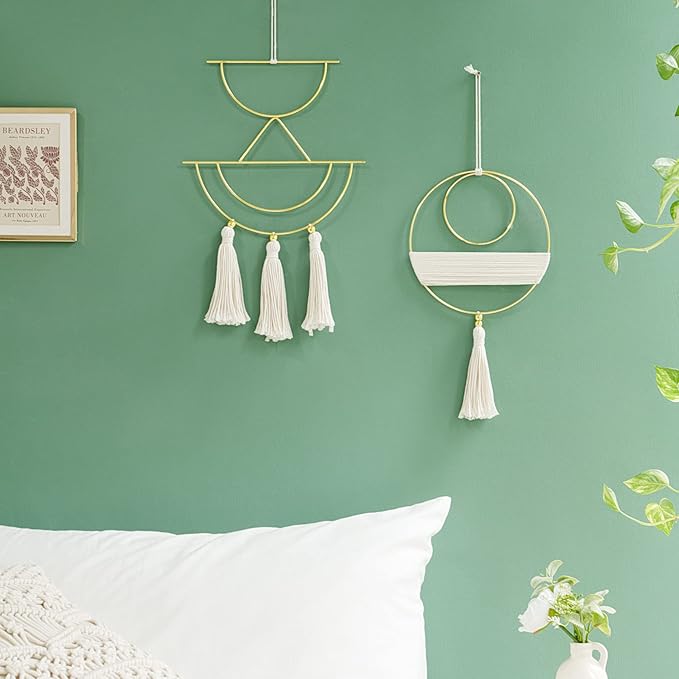 • Unique Design: The design conbines high quality iron with golden powder cover and handmade cotton tassels. Bohemia style wall hangings are great decoration for any space. And they will match well with your home style as well.