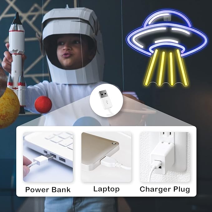- Spaceship Bedroom Decor: Are you looking to add a little brightness and interesting thing to your room or office, the alien flying saucer shape neon sign can deliver just the right amount of luminosity and add fun atmosphere.