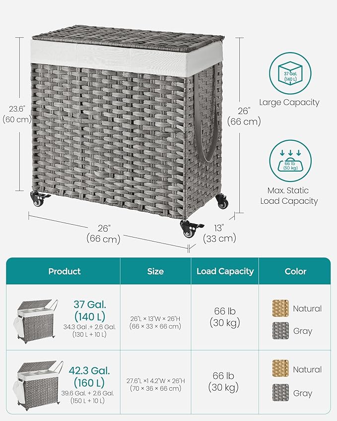 - 【WATERPROOF, VENTILATED & STURDY】The breathable, waterproof PP rattan helps your clothes stay dry and well-ventilated while the sturdy metal frame makes this rolling laundry hamper robust enough to hold up to 66 lb