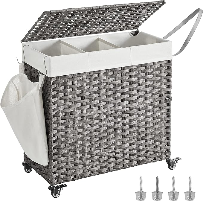 SONGMICS Laundry Hamper with Lid, 37 Gallons (140 L), Rolling Laundry Basket with Wheels, 3-Section Synthetic Rattan, Removable Liner, Bedroom, 26 x 13 x 26 Inches, Gray ULCB363G01