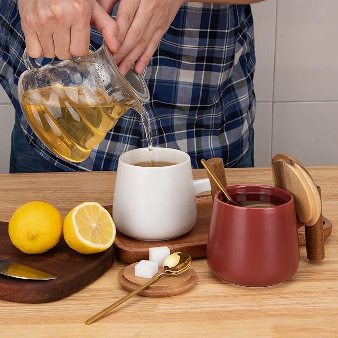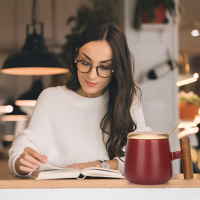 14 Oz Ceramic Coffee Mug with Lid and Coffee Spoon for Latte,Cappuccino Mug, Cocoa Mug, Tea Mug, Birthday Gifts for Women, 1 Pack (Matte Red)