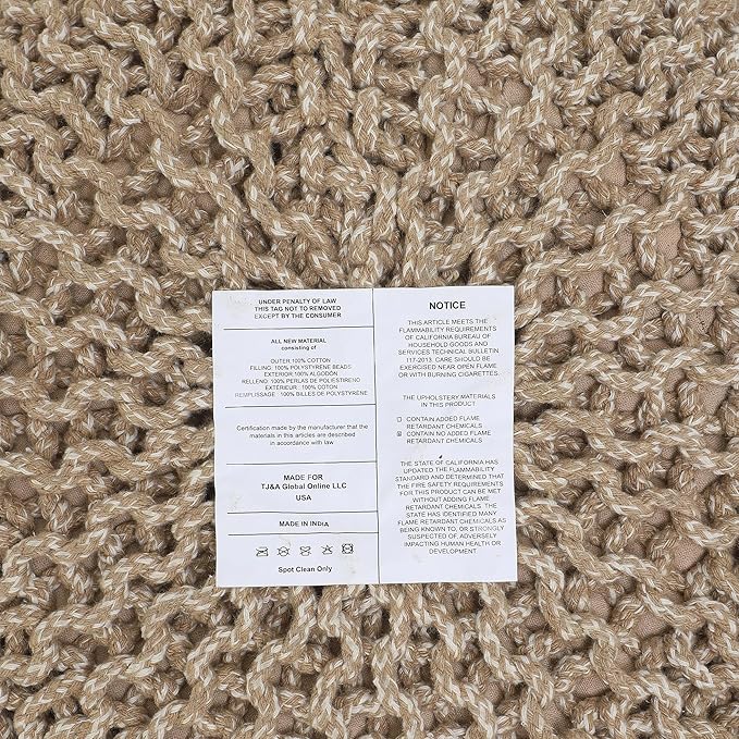 - HANDMADE FROM THE FINEST MATERIALS: The outer material on this farmhouse indoor pouf ottoman is made from 100% cotton and filled with high-density EPS beads. Each floor pouf measures 19.5"x19.5"x14" inches and is handmade by our talented artisans. Please allow a size variation of 1-2 cm as each piece is unique. As this is a round shaped accent pouf, place the tape at the widest part (center of ottoman) on both sides while measuring to get the right dimension