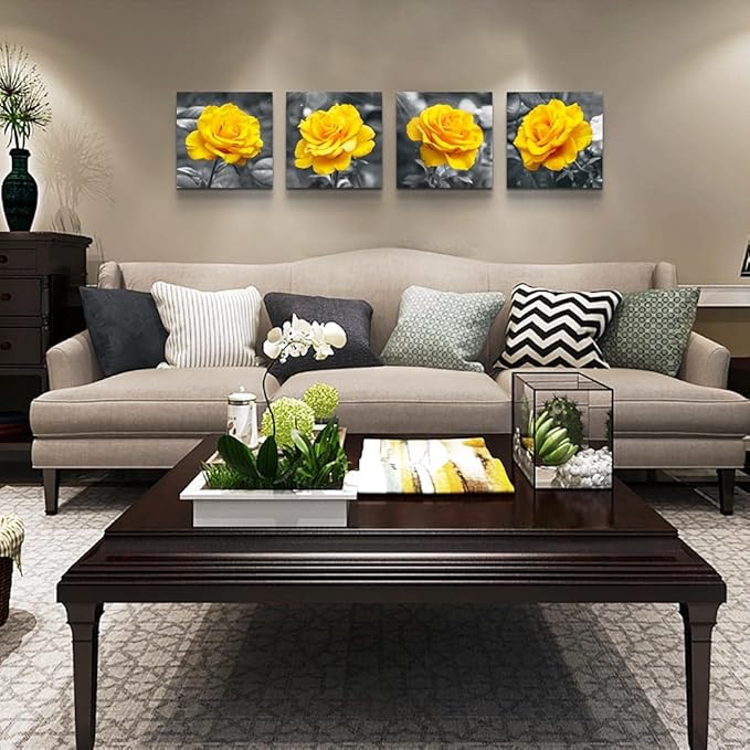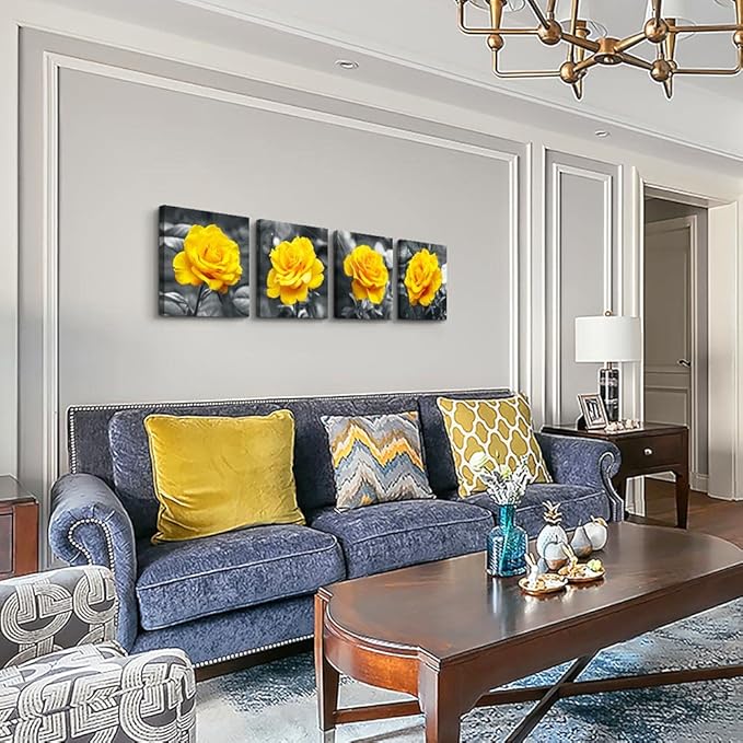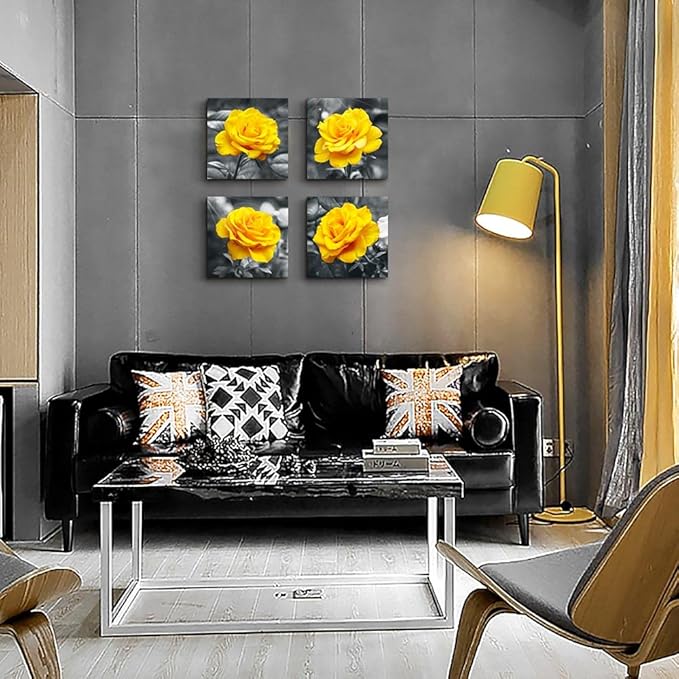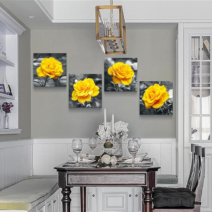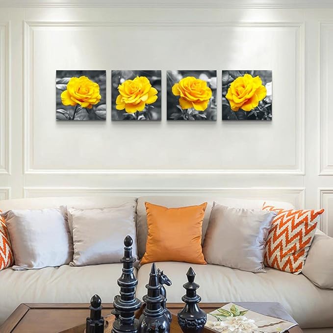 Canvas Wall Art For Living Room Family Wall Decor For Bedroom Modern Kitchen Wall Decorations Black And White Wall Pictures Artwork Yellow Rose Flowers Canvas Art Prints Bathroom Home Decor 4 Piece