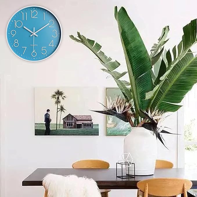 - Eye-Catching Numeric - 12 Inch Wall Clock Diameter: 30.5cm; Thickness: 4.3cm; Large and clear Arabic Numbers at every hour tracker make it easy to read from any corner of your room. Large Lake Blue Modern Wall Clocks is best decoration to living room,bathroom and kitchen.It makes your home looks more beautiful.