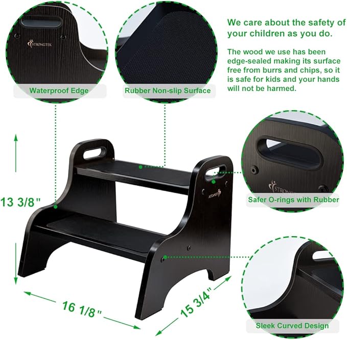 StrongTek Wood 2 Step Stool for Kids with Non-Slip Stepping Surface, Portable Handles, Skid Resistant Foot Pads, and 300 lbs. Capacity, Multipurpose Heavy-Duty Support (Espresso)