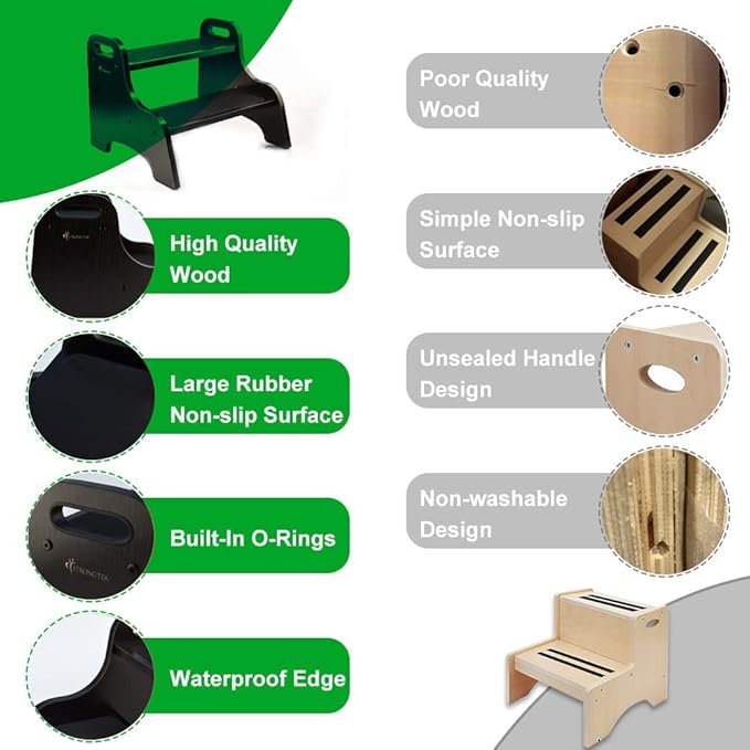 - Heavier-Duty Weight Capacity – The smarter frame design and wooden structure provides our kid’s step stool for a larger 300-lbs. overall weight capacity to ensure babies, toddlers, pre-teens, and even adults can use it.