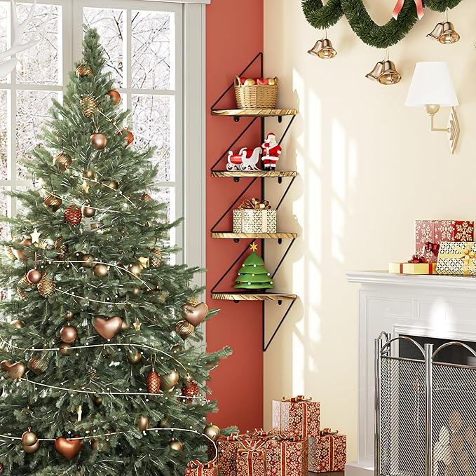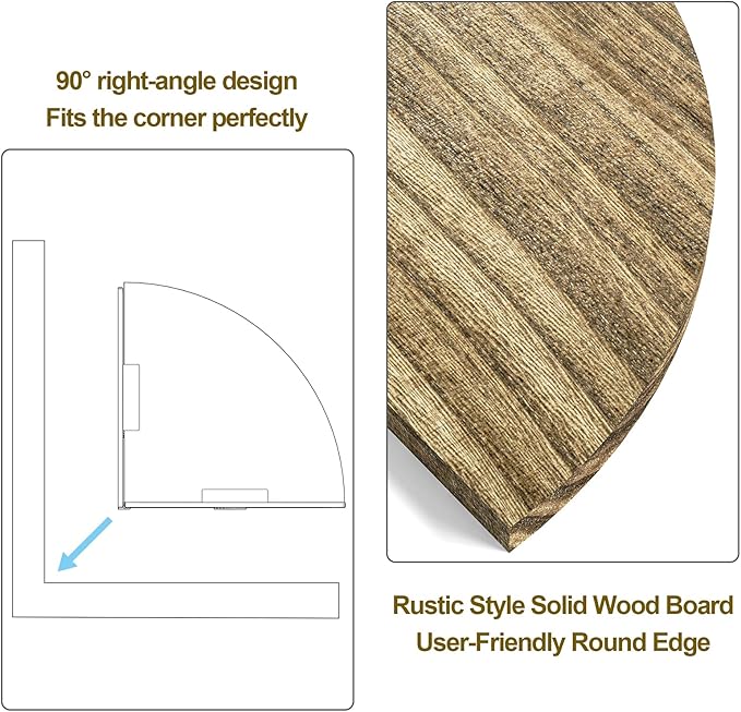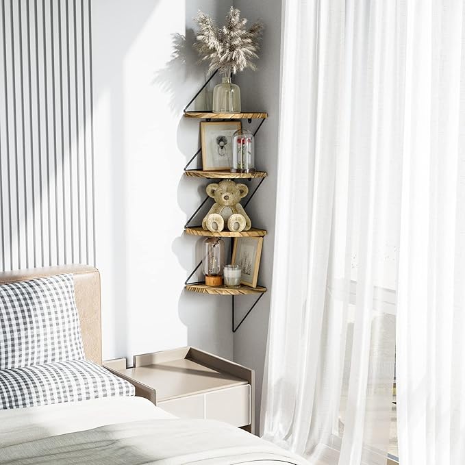 - Premium Corner Shelves Wall Mounted: Triangular metal brackets enforce the stability of the shelves, and solid paulownia wood boards make it more sturdy and last for long. The metal groove joint firmly connects the brackets and boards, making it strong and stable to load your items.