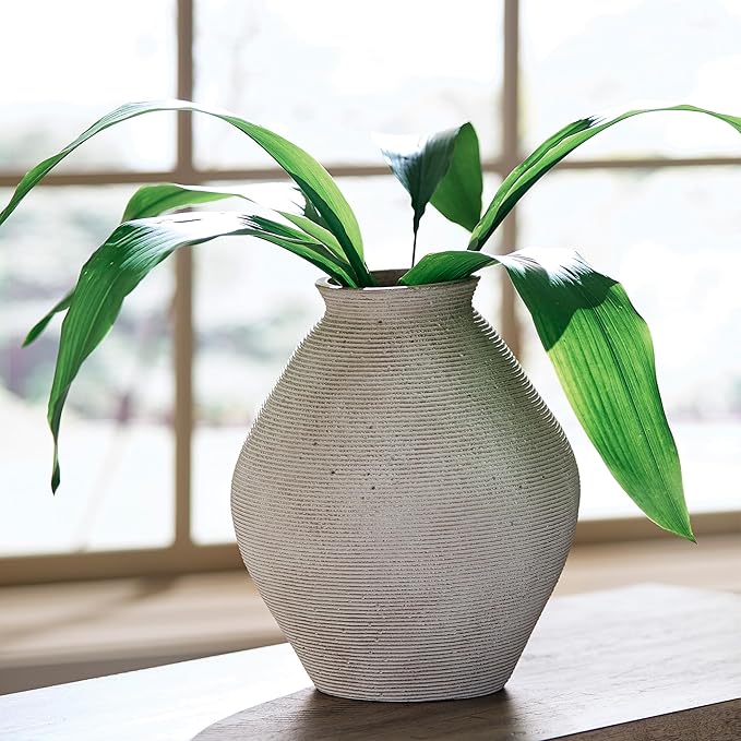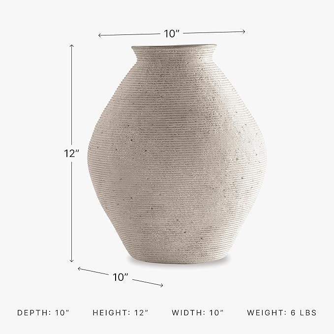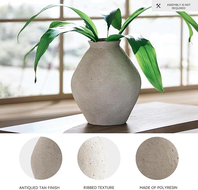 - TEXTURED VASE: Ribbed textural rings give this vase a wonderful artisanal quality. The antiqued tan finish is elegant yet versatile, pairing well with existing living room decor