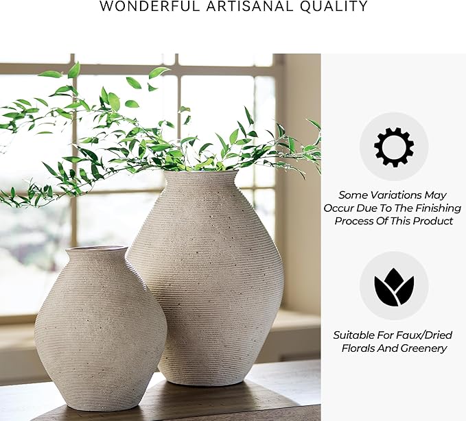 - TEXTURED VASE: Ribbed textural rings give this vase a wonderful artisanal quality. The antiqued tan finish is elegant yet versatile, pairing well with existing living room decor